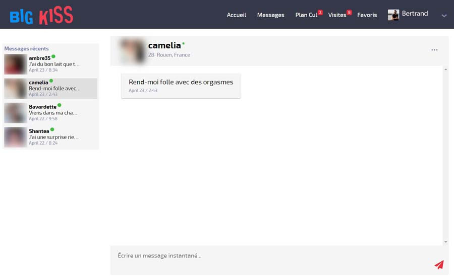 Autant vous le dire, si vous aimez prendre le temps de connaître votre plan cul avant de passer aux choses sérieuses, vous risquez de vous sentir un peu bousculer sur Big-Kiss. La grande majorité des femmes avec quoi nous avons discuté n’y vont vraiment pas par quatre chemins. Il n’est pas rare que l’échange érotique commence avant même d’avoir le temps de dire « bonjour ».