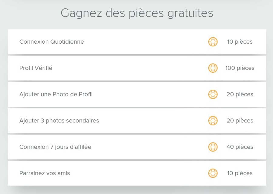 Son système de pièces vous permet de payer uniquement en fonction de votre utilisation. En effet, elles vous permettent d’envoyer des messages aux autres membres. Comptez 40 pièces par message. Si cela peut paraître un peu cher, mais il faut dire qu’il s’agit tout de même d’un gros plus pour tous ceux qui pensent utiliser la plateforme de manière sporadique. D’autant que les pièces n’ont pas de durée limitée !