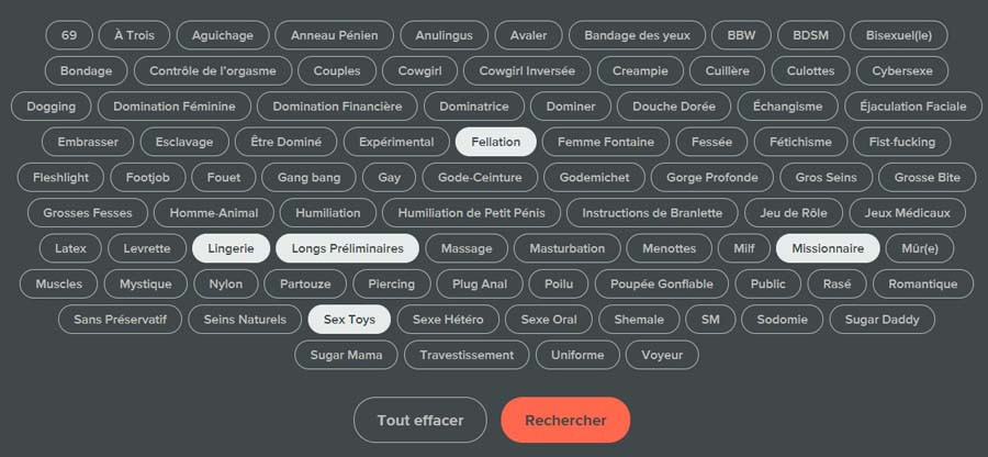 Vous l’aurez compris, sur Eliteadults, on cherche clairement à assouvir nos envies de sexe ! Ici pas question de rencontrer l’âme sœur, si ce n’est sur le plan sexuel ! C’est donc tout naturellement que l’outil de recherche vous permettra d’appliquer un filtre en fonction de votre humeur coquine ! Très pratique pour varier les plaisirs, et pourquoi pas pour vous laisser tenter par une pratique inconnue ?