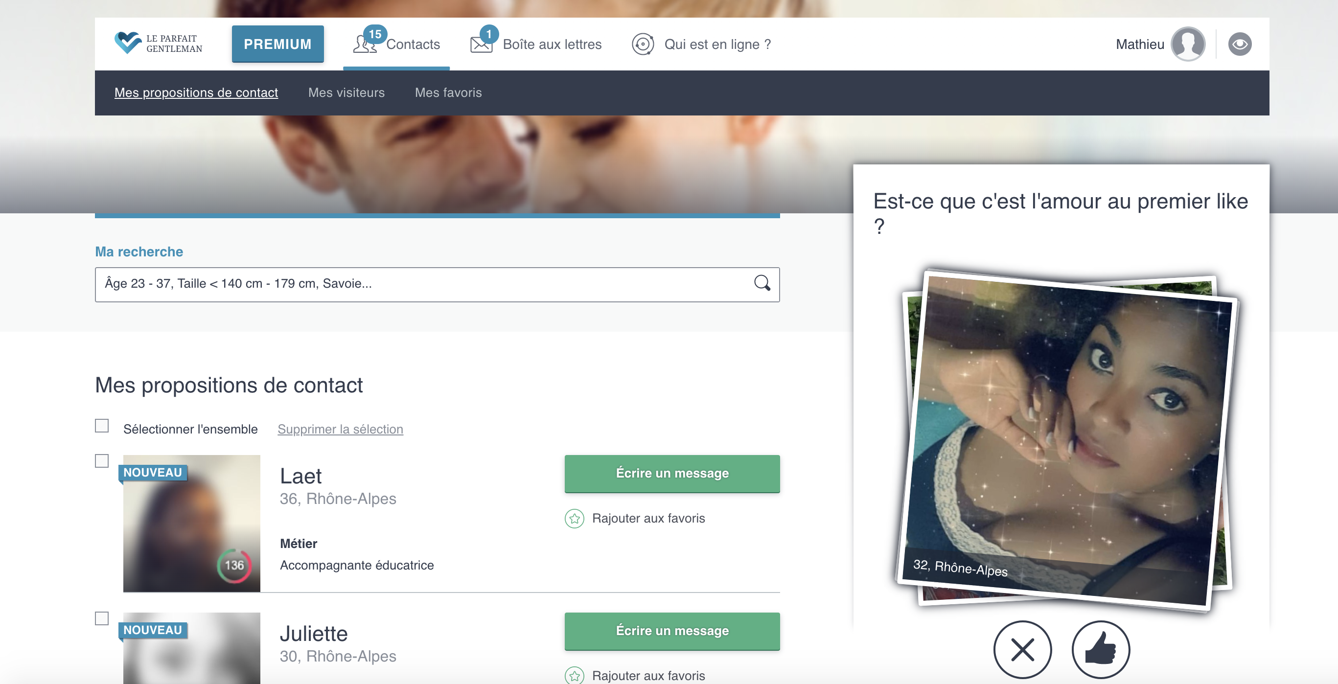 L’accueil est en quelque sorte un tableau de bord. Il affiche le nombre de nouveaux messages, sans pour autant en dévoiler les expéditeurs ou des extraits. Il faudra donc se rendre dans la messagerie pour voir de quoi et de qui il s’agit. Un autre encadré vous propose de modifier les photos de votre profil. Enfin, une liste de 5 profils apparaît avec une photo, le prénom, l’âge, le département et le métier de la personne. Ces contacts potentiels sont triés par ordre de pertinence, selon le niveau de matching qui s’affiche en bas à droite de la photo. Vous avez alors la possibilité pour chaque contact de l’ajouter dans vos favoris ou de lui envoyer un message. Si ces profils ne vous semblent pas coller à vos attentes, vous avez la possibilité de modifier en quelques clics vos critères de présélection.
