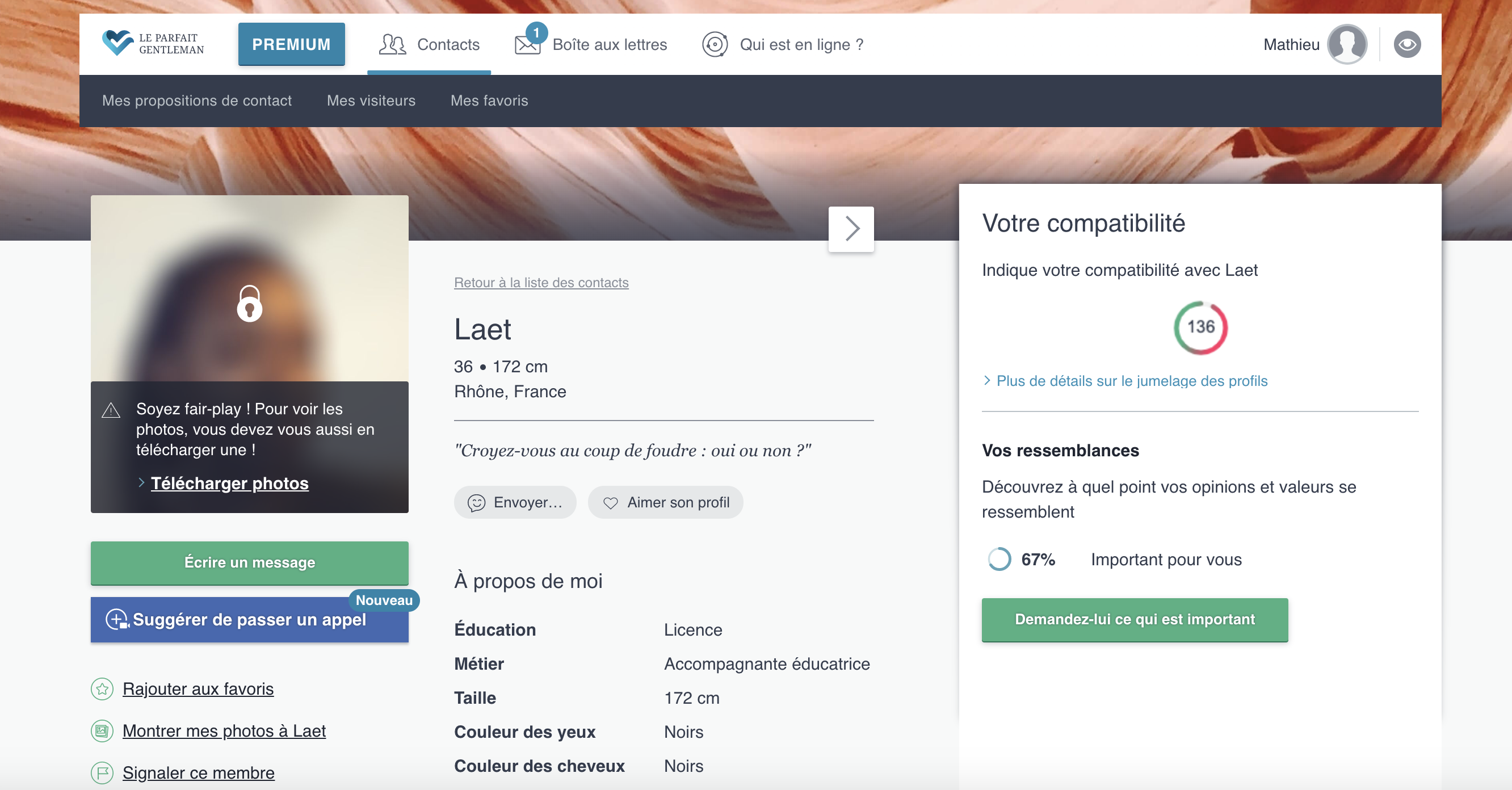 La rubrique Contact permet d’accéder à la liste complète des profils potentiellement compatibles avec le vôtre. Comme dans l’accueil, vous pouvez alors envoyer un message ou ajouter chaque contact dans vos favoris. Sur ces deux pages, la colonne de droite offre également plusieurs fonctionnalités :