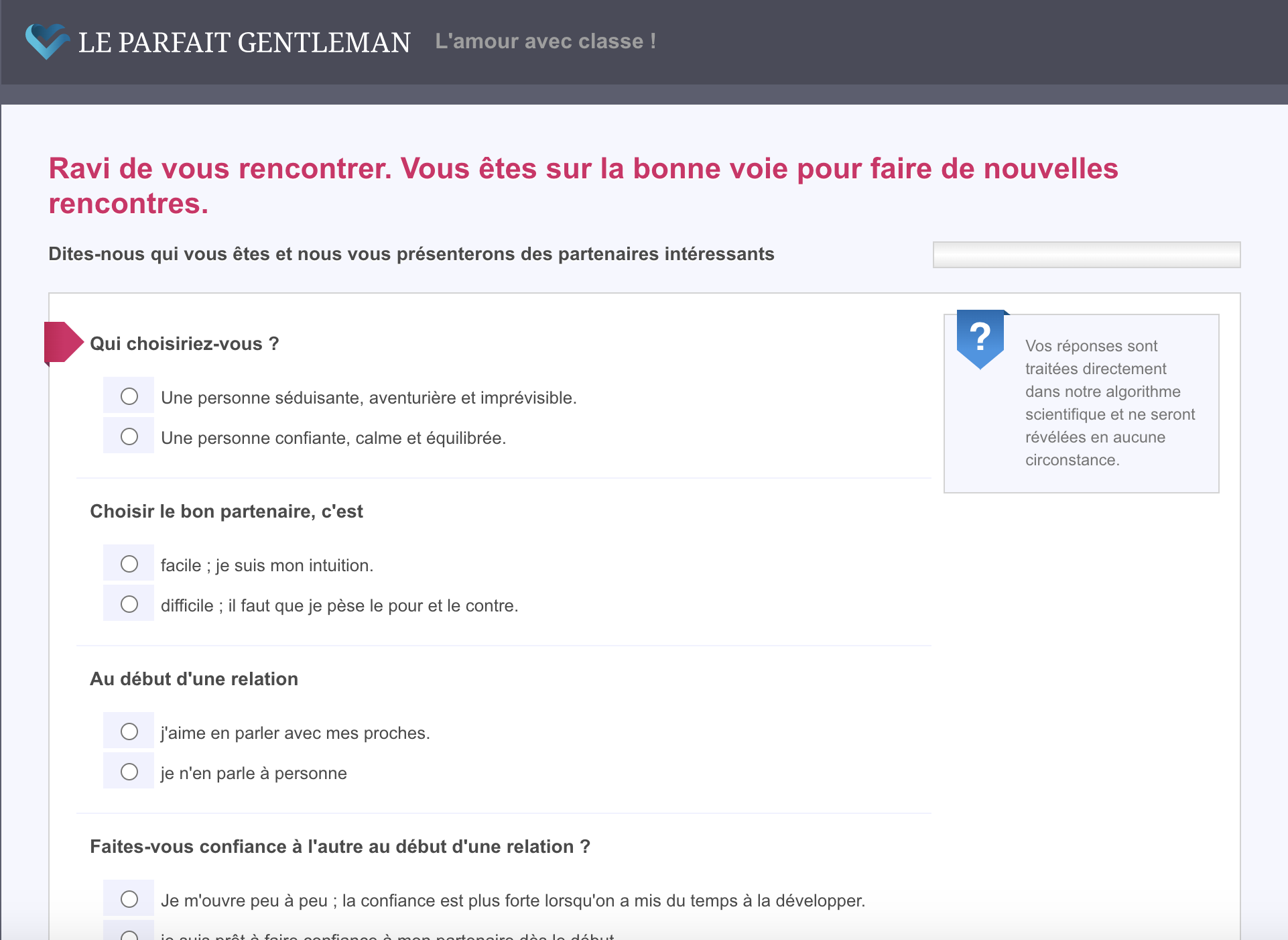 S’inscrire sur le site Le Parfait Gentleman ne nécessite que 20 à 30 minutes. Le test de personnalité sur lequel se base le matchmaking du site ne compte que 34 questions destinées à cerner votre personnalité, ainsi que ce que vous recherchez. Ainsi sont posées des questions telles que « Vous vous décririez plutôt comme… » ou encore « Vous recherchez plutôt quelqu’un de… ». D’autres interrogations au sujet des convictions et habitudes sont également de la partie telles que « votre religion », « votre consommation d’alcool » ou encore « votre consommation de tabac ». En revanche, rien n’est demandé concernant vos préférences à ces sujets.