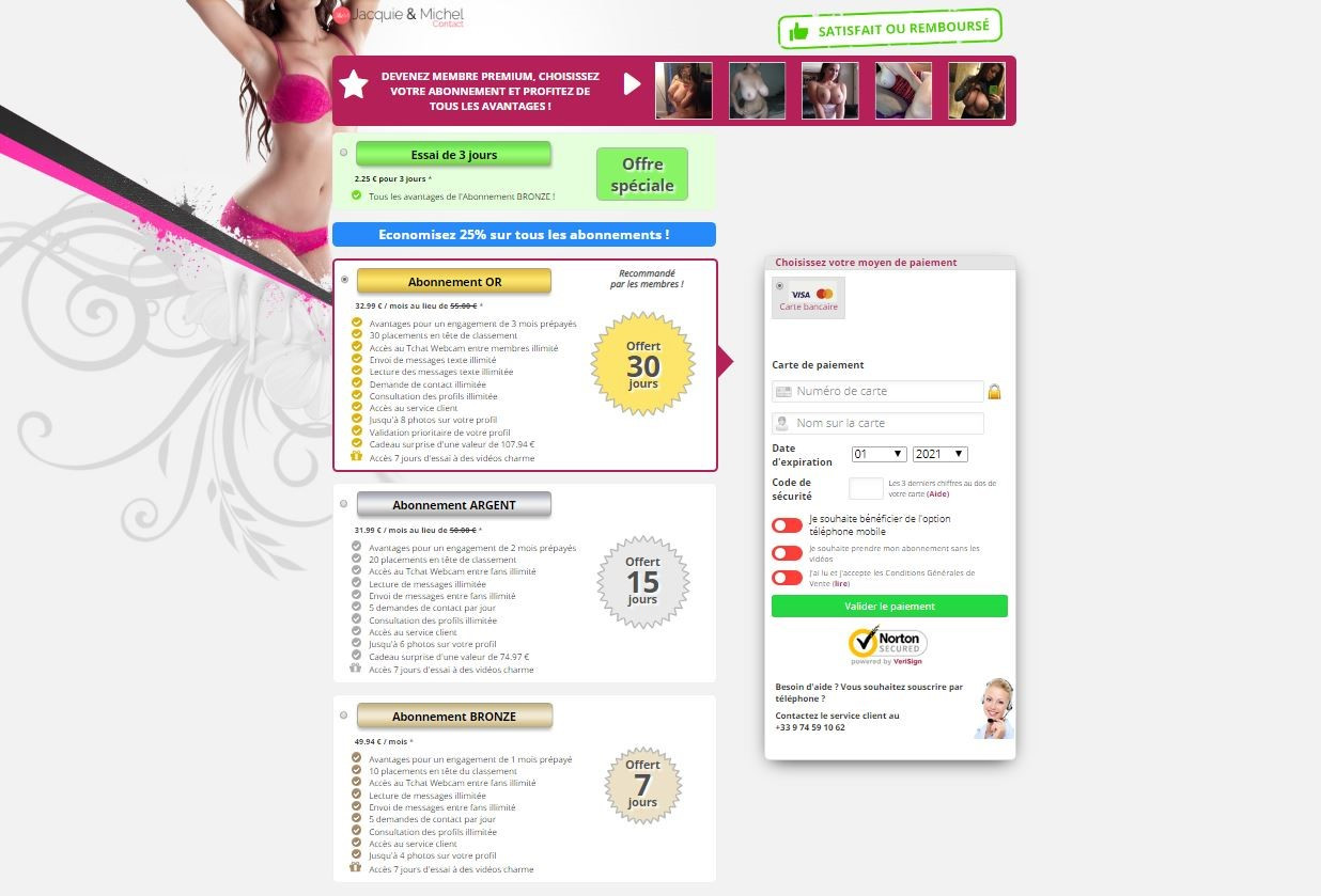 Heureusement, il y a l’offre d’essai 3 jours, qui permet de se faire un avis sur Jacquie et Michel Contact pour seulement 2,25 € en bénéficiant des avantages de l’abonnement le moins cher. D’autre part, le site affiche clairement la mention « Satisfait ou remboursé ». C’est plutôt rassurant, car si on n’a pas de contact, on peut se faire rembourser. En plus, à certains moments il est possible de trouver code de réduction pour payer l’abonnement moins cher. Pour le reste, ce site de plan cul fonctionne avec des abonnements qui permettent d’accéder à tous les services de la plateforme, c’est à dire :